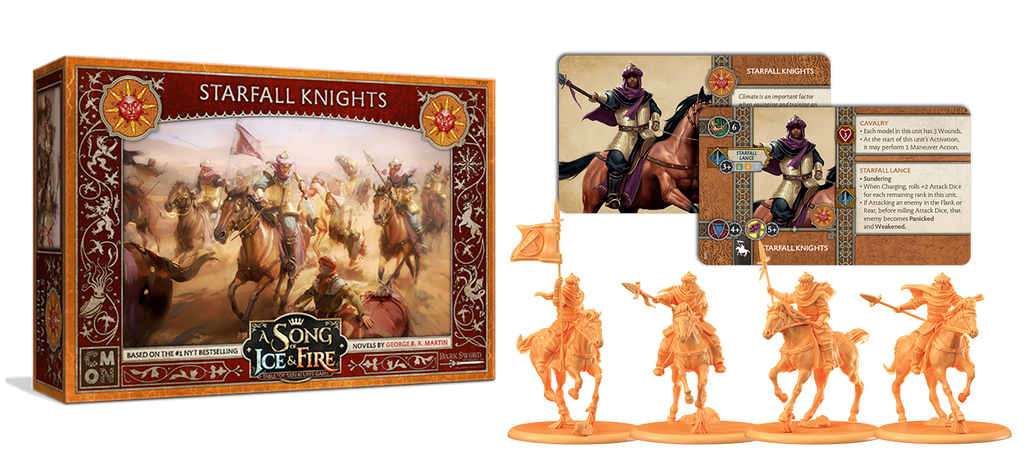 The Starfall Knights unit box for the A Song of Ice and Fire: Tabletop Miniatures Game gives House Martell a heavy cavalry unit to add to their forces. The Knights train relentlessly with their lances, using them to devastating effect during a charge. If they can strike an enemy on the flanks or rear, the devastation is near-complete.