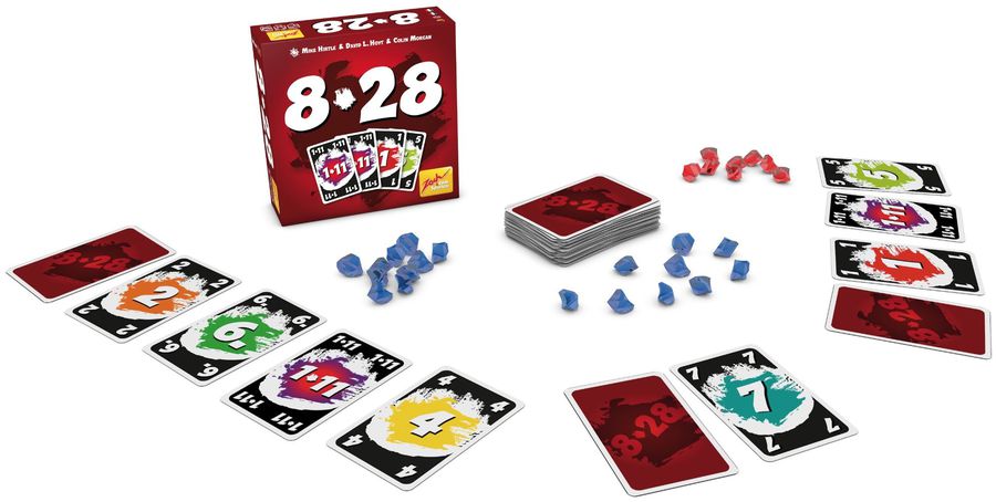 8-28 is a press your luck card game. At the start of the game, each player gets one card they look at, then place face down in front of them. The cards have values ranging from 1 to 11. During the course of the game, the players may draw one random additional card per round to place face up in front of them. As long as any player still wants cards, gems are added to a pile. The round ends only when no one wants to take any more cards. Then, all cards are revealed and the two players whose cards are closest to a total of 8 and 28 respectively, without going over, share the gems among them.