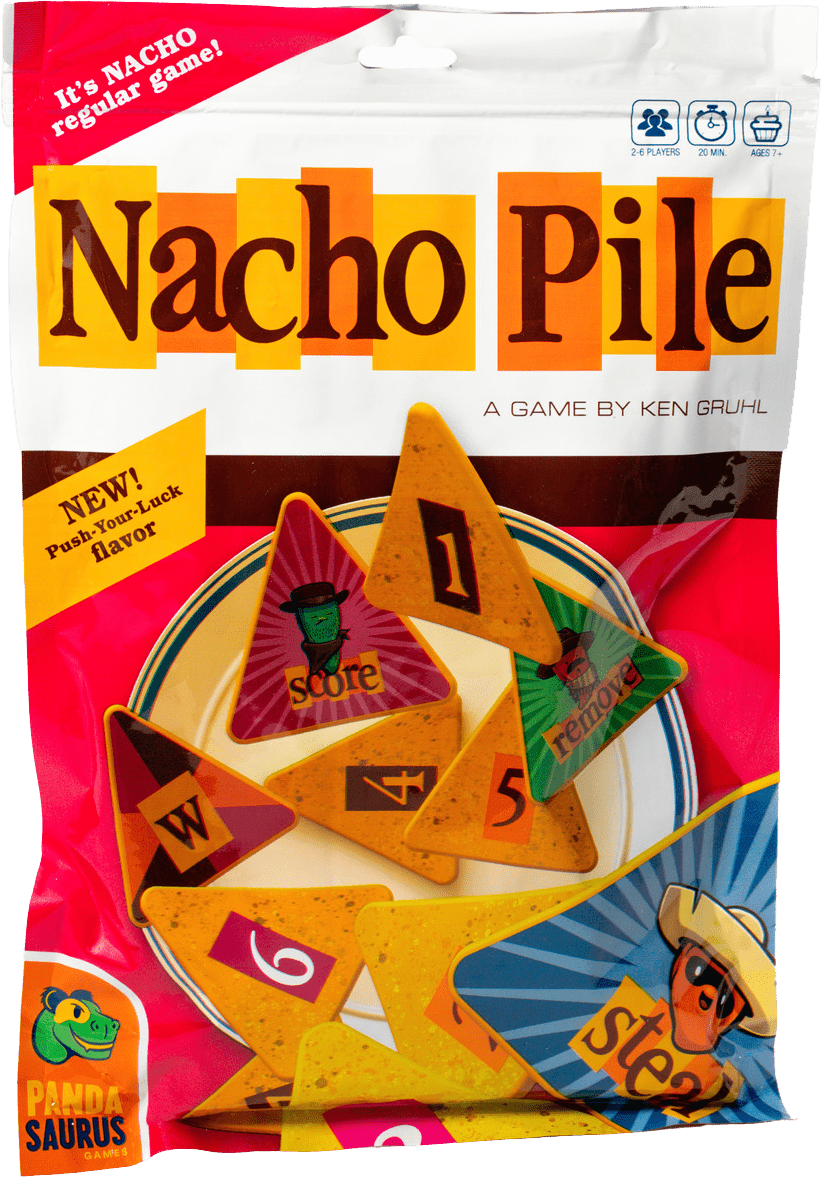 Nacho Pile is a fast-paced, high-energy game that will have chips flying back and forth as players compete for full plates and stomachs. In the game, players must push their luck to pile their nacho plates high, but also cleverly snatch matching chips from other players. Don't get too risky or you will lose them all! Keep an eye out for special chips that really ramp up the heat with spicy effects.