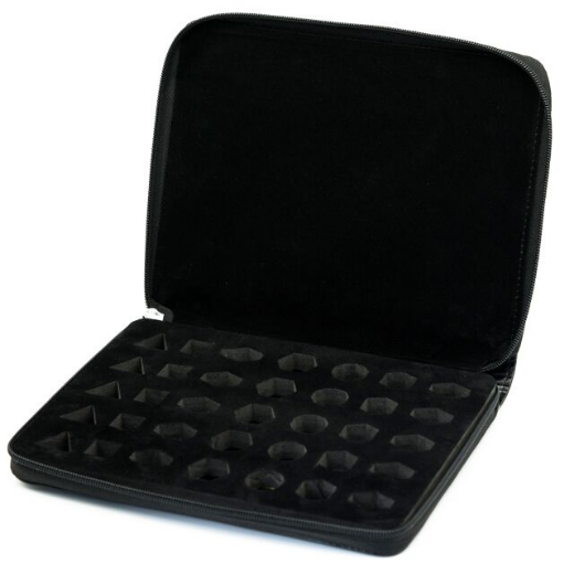 This Leather Dice Book features a smooth leather surface, a zipper to hold the book closed, and 35 slots to store your most valuable dice!