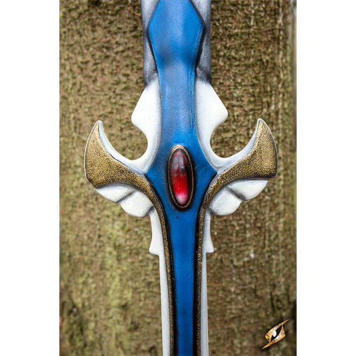 Epic Armoury’s Spear of Light is a 190 cm latex spear inspired by paladins and clerics of light. In the hands of the lawfully good, this spear features a 38 cm long leaf-blade and 76 cm long staff. Hand painted and sculpted, the finished result is a beautiful fantasy weapon with an intricate double-edged spearhead. Sculpted blue and white wings and hand painted red stones give angelic character to the crossguard and pommel.