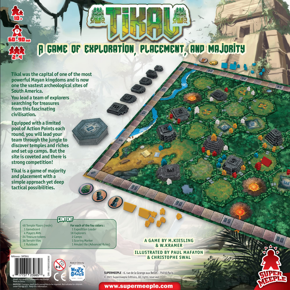 Tikal is a game of exploration within the Central American jungles in search of lost temples and the treasures within. Players send their team of explorers into the jungle, exposing more and more of the terrain. Along the way, you find temples that require further uncovering and treasures. Players attempt to score points for occupying temples and holding onto treasure.
