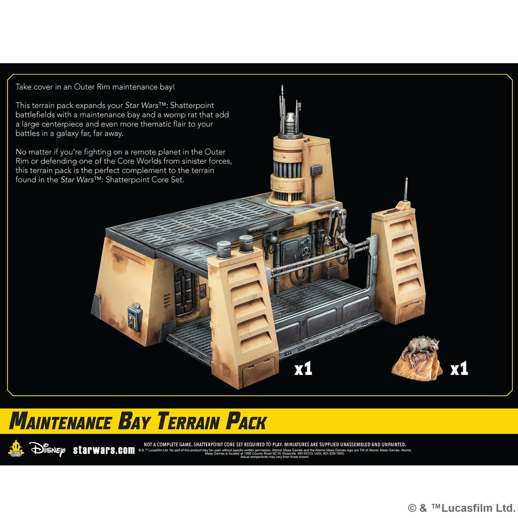 This Outer Rim maintenance bay joins our collection of terrain packs for Star Wars™: Shatterpoint. Together with its mischievous womprat, this terrain adds a thematic centerpiece to create cover and enhance gameplay as well as providing an exciting hobby opportunity for assembly and painting. It is the perfect compliment to the terrain found in the Star Wars: Shatterpoint Core Set.
