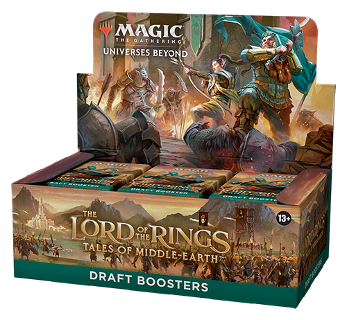 The Lord of the Rings: Tales of Middle-earth Draft Booster Box contains 36 The Lord of the Rings: Tales of Middle-earth Draft Boosters and 1 Traditional Foil Box Topper card. Each Draft Booster contains 15 cards and 1 token/ad card or Helper card, including 1 card of rarity Rare or higher and 3 Uncommons, 10 Commons, and 1 Land cards. Traditional Foil Borderless Mythic Rare card in <1% of boosters. Traditional Foil of any rarity replaces a Common in 33% of boosters.