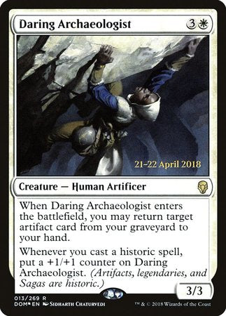 Whenever you cast a historic spell, put a +1/+1 counter on Daring Archaeologist. (Artifacts, legendaries, and Sagas are historic.)