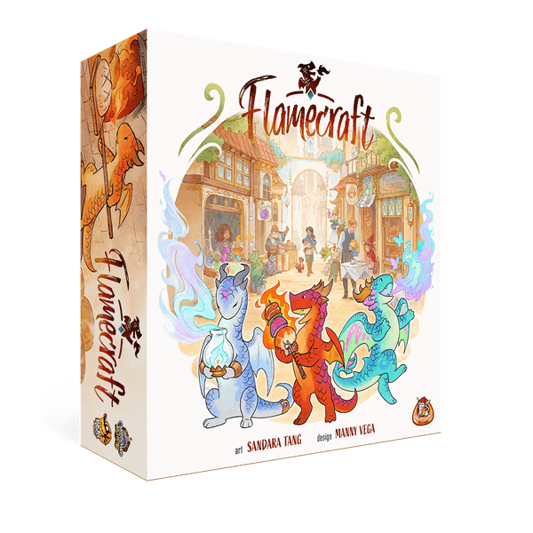 In Flamecraft, 1-5 players take on the role of Flamekeepers, gathering items, placing dragons and casting enchantments to enhance the shops of the town. Dragons are specialized (bread, meat, iron, crystal, plant and potion) and the Flamekeepers know which shops are the best home for each. Visit a shop to gain items and a favor from one of the dragons there. Gathered items can be used to enchant a shop, gaining reputation and the favors of all the dragons in the shop. If you are fortunate enough to attract fancy dragons then you will have opportunities to secure even more reputation.