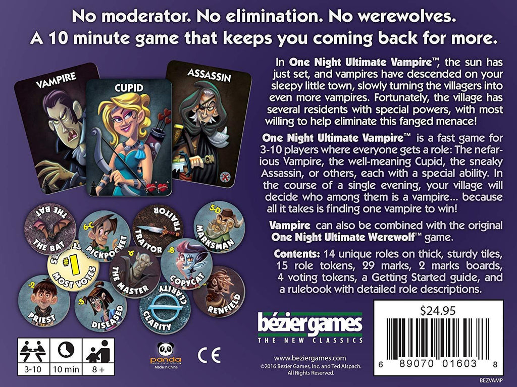 No moderator, no elimination, no werewolves. In One Night Ultimate Vampire, the sun has just set, and vampires have descended on your sleepy little town, slowly turning the villagers into even more vampires. Fortunately, the village has several residents with special powers, with most willing to help eliminate this fanged menace! One Night Ultimate Vampire is a fast game for 3-10 players in which everyone gets a role: The nefarious Vampire, the well-meaning Cupid, the sneaky Assassin, or others, each with a special ability. In the course of a single evening, your village will decide who among them is a vampire...because all it takes is finding one vampire to win! One Night Ultimate Vampire can be combined with One Night Ultimate Werewolf or One Night Ultimate Werewolf Daybreak or both games.