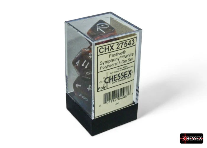 Set of Polyhedral Dice from Chessex for classic tabletop RPG and Board Games. Each die comes in an elemental colour with contrasting numbers.