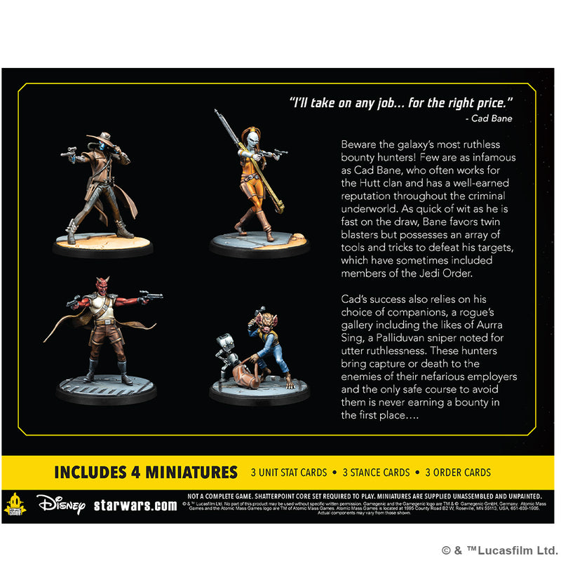 The galaxy's most ruthless bounty hunters enter Star Wars: Shatterpoint in this pack! The clever and fearsome Cad Bane has built his reputation working for the Hutts and even Darth Sidious himself and this pack adds him to the game as a Primary Unit. Joining him are the deadly Aurra Sing as a Secondary Unit and a Bounty Hunter unit consisting of a Chadran-Fan, Todo 360, and a Devaronian as new Supporting Unit. In addition to beautifully sculpted miniatures of these characters, this pack also includes all the Unit, Stance, and Order cards for players to make full use of them in Star Wars: Shatterpoint!