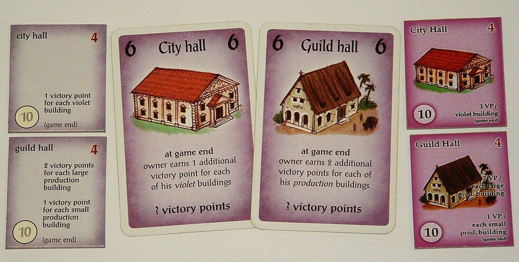 Players earn victory points for owning buildings, for shipping goods, and for manned "large buildings." Each player's accumulated shipping chips are kept face down and come in denominations of one or five. This prevents other players from being able to determine the exact score of another player. Goods and doubloons are placed in clear view of other players and the totals of each can always be requested by a player. As the game enters its later stages, the unknown quantity of shipping tokens and its denominations require players to consider their options before choosing a role that can end the game.