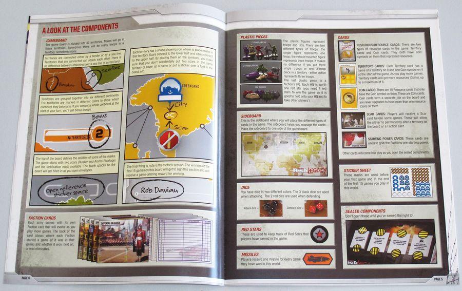 Risk Legacy represents what is if not a new, at least a rare concept to boardgaming: campaigning. At its core, the game, particularly at first, plays much like regular Risk with a few changes. Players control countries or regions on a map of the world, and through simple combat (with players rolling dice to determine who loses units in each battle) they try to eliminate all opponents from the game board or control a certain number of "red stars", otherwise known as victory points (VPs).