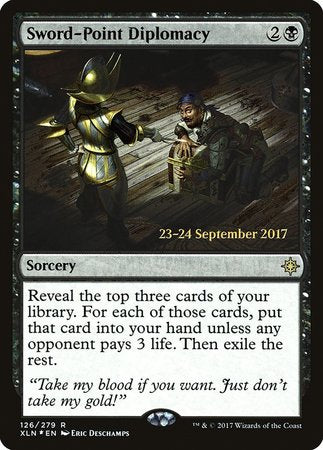 Reveal the top three cards of your library. For each of those cards, put that card into your hand unless any opponent pays 3 life. Then exile the rest.