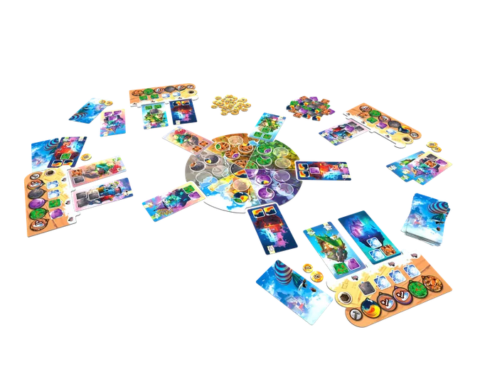 The aim of the game is to win the most gold by crafting and selling those famous floating islands. Each turn, the players/architects can either select a new island creation contract, produce resources amongst the 5 existing types, or allocate these resources on their contracts to craft them. Players have limited spaces to store these contracts and resources, so they’ll have to juggle with their production line to complete their objectives in an optimized manner!